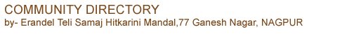 It is seen that our community is found mainly in Vidharbha. In some part of Madhya Pradesh ,Chhatisgad, and Gujrat. We are trying to prepare a Directory of our community. You are requested to send the necessary details on E-mail shri_santaji@yahoo.com or on office address or to our district/ tahsil representative, to prepare the Directory ,which will be benificial to all of us. Thanking you.